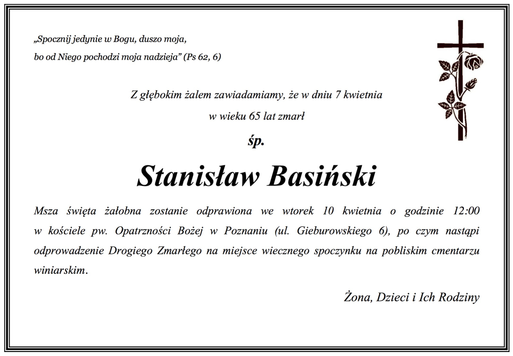 Pogrzeb Stanisława Basińskiego, radnego gminy Ostrowite odbędzie się we wtorek w Poznaniu.