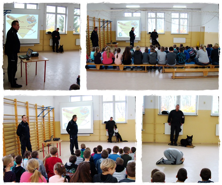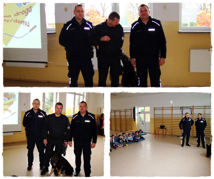 7 listopada do Szkoły Podstawowej w Trąbczynie zawitali zaproszeni przez panią Maję Nowaczyk policjanci z Posterunku Policji w Zagórowie :sierż. sztab. Zbigniew Królasik, asp. Paweł Ławniczak oraz mł. asp. Dariusz Ryźlak z Komendy Powiatowej Policji w Słupcy wraz z psem tropiącym. Uczniowie z klas I-IV dowiedzieli się wielu ciekawych informacji dotyczących m.in. pracy psa policyjnego i jego opiekuna, poznali zasady zachowania się wobec obcych psów i osób. Na koniec policjanci przypomnieli uczniom zasady bezpiecznego poruszania się po drodze, a także zwrócili szczególną uwagę na zasady bezpiecznego korzystania z Internetu.