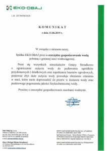 W związku z okresem suszy, spółka Eko-Dbaj prosi o oszczędne gospodarowanie wodą pobraną z gminnej sieci wodociągowej w Strzałkowie. – Prosi się wszystkich mieszkańców o ograniczenie zużycia wody do podlewania ogródków przydomowych i działkowych oraz napełniania basenów ogrodowych, ponieważ zbyt duże zużycie wody powoduje obniżenie ciśnienia w sieci, które może doprowadzić do przerw w dostawie wody oraz punktowego pogorszenia jakości fizykochemicznej wody – informuje przedstawiciel Eko-Dbaj.