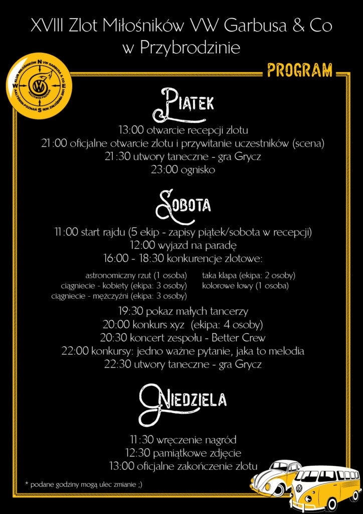 W weekend 22-24 czerwca br. na polu namiotowym w Przybrodzinie Klub Miłośników VW Garbusa Aaltświn z Poznania jak co roku organizuje zlot garbusów, busów, karmanów i co. Zlot to już tradycja. Pomysł jego zorganizowania zrodził się na przełomie wieków i co roku przyciąga nad Jezioro Powidzkie rzesze sympatyków uroczego i niewielkiego, ale jednocześnie funkcjonalnego pojazdu zaprojektowanego w 1934 r. przez Ferdynanda Porsche.- Już po raz 18. zapraszamy tradycyjnie w przedostatni weekend czerwca do Przybrodzina. Zapewniamy oczywiście piękną pogodę oraz moc atrakcji dla dużych i małych. Brakuje tylko Was i Waszych VW. Zapraszamy w 2018! Byle do Przybrodzina! – piszą organizatorzy.
