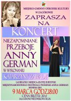 Specjalnie na zbliżający się Dzień Kobiet Miejsko – Gminny Ośrodek Kultury w Zagórowie dla Pań m specjalną ofertę Koncertu Niezapomniane Przeboje Anny German w wykonaniu Katarzyny Zawady z Żegocina. Pani Kasia gościła już w zagórowskim Domy Kultury jako gość specjalny , ale tym razem przybędzie z Koncertem piosenek Anny German i zaprezentuje własną interpretację przebojów tej legendarnej artystki. Należy dodać że Pani Kasia to zdobywczyni I miejsca „Złotej Eurydyki” na Międzynarodowym Festiwalu Piosenki -Anna German w Moskwie. Koncert odbędzie się 9 marca o godz. 18.00 a bilet to 20 zł. Już prowadzona jest rezerwacja biletów.