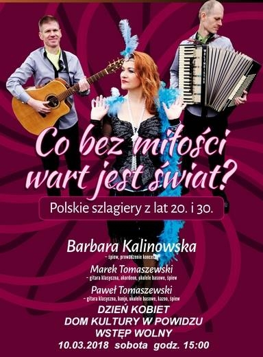 W sobotę, 10 marca w powidzkim Domu Kultury odbędzie się koncert z polskimi szlagierami lat 20. i 30. pt. „Co bez miłości wart jest świat?” podczas którego wystąpią Barbara Kalinowska – śpiew oraz Marek i Paweł Tomaszewscy – oprawa muzyczna.