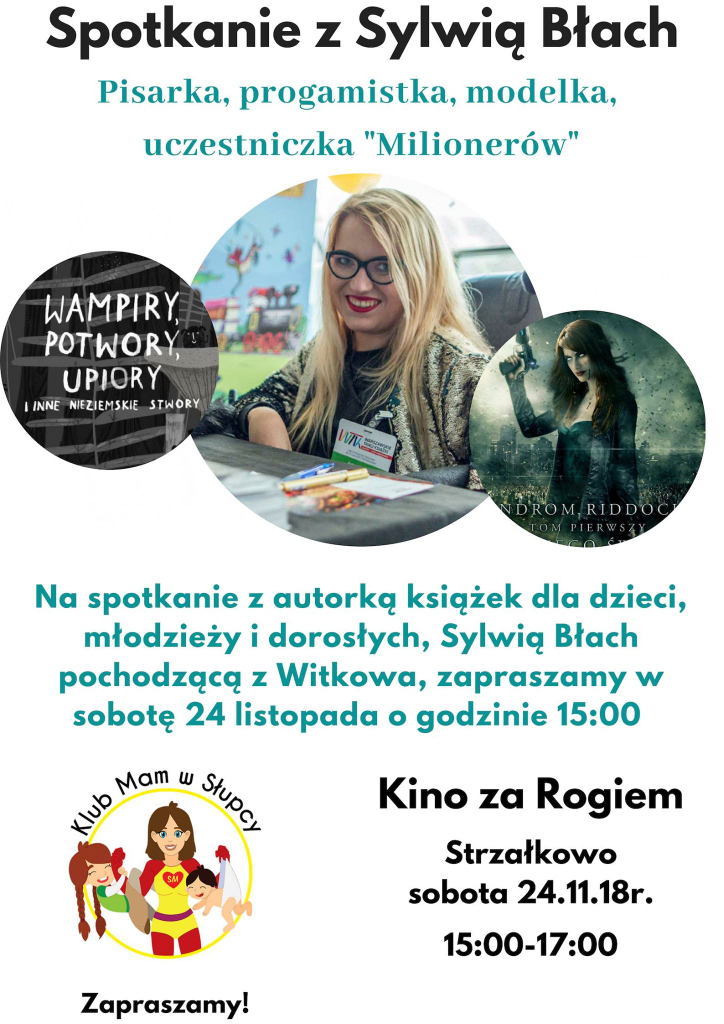Specjalnie dla Was, odbędzie się spotkanie autorskie z Sylwią Błach (https://www.facebook.com/blach.sylwia) w sobotę 24 listopada o godzinie 15:00, w Kinie za Rogiem w Strzałkowie,