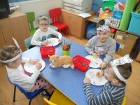 W tym dniu , każde dziecko przyniosło swoją maskotkę i zdjęcia kota. Od samego rana dzieci brały udział w zabawach ruchowych , recytowały wiersze i śpiewały piosenki o kotach, wcielając się w ich rolę. Dzieci na podstawie literatury i gazetki tematycznej poznawały kocią naturę, która bardzo fascynuje i zadziwia od tysięcy lat. W czasie zabaw i swobodnych rozmów wypełnionych śmiechem przedszkolaki uświadomiły sobie ,że należy mieć poczucie odpowiedzialności za posiadanie swojego pupila oraz ,że nie wolno ich krzywdzić. Na zakończenie zajęcia dzieci z ciekawością wysłuchały bajki pt”Chory kotek” S.Jachowicza oraz oglądały bajeczkę „Przygody kota Filemona „. Natomiast praca plastyczna „kotek na talerzu” ozdobiła kącik dla rodziców. Koci dzień w grupie „kotków” długo pozostanie w pamięci przedszkolaków .