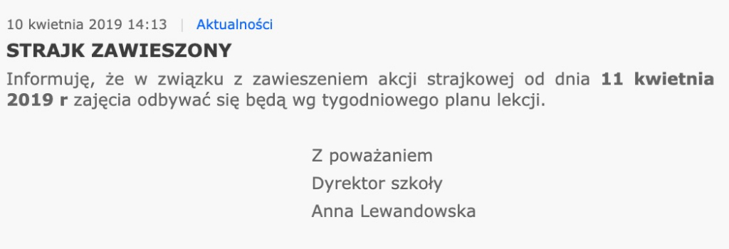 Po dwóch dniach strajku, w szkole w Koszutach jutro znowu będą prowadzone zajęcia dydaktyczne. O zawieszeniu strajku na stronie internetowej szkoły poinformowała dziś dyrektor Anna Lewandowska.