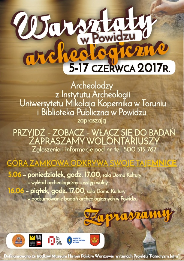 W dniach 5-17 czerwca br. w Powidzu odbędą się warsztaty archeologiczne organizowane przez archeologów z Instytutu Archeologii Uniwersytetu Mikołaja Kopernika w Toruniu i Bibliotekę Publiczną Gminy Powidz. W ramach warsztatów, w poniedziałek 5 czerwca o godz. 17.00 w sali powidzkiego Domu Kultury odbędzie się wykład archeologiczny (wstęp wolny). Podsumowanie prowadzonych badań archeologicznych planowane jest na piątek 16 czerwca o godz. 17.00 w sali Domu Kultury. – Przyjdź, zobacz, włącz się do badań – zapraszają organizatorzy. Zainteresowani wolontariusze mogą zgłaszać się pod nr tel. 500 515 767. Program dofinansowywany jest ze środków Muzeum Historii Polski w Warszawie w ramach projektu „Patriotyzm jutra”.