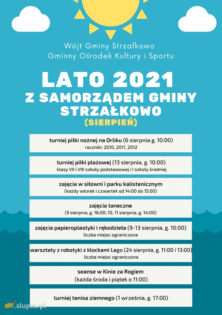 Akcja „Lato 2021 z Samorządem Gminy Strzałkowo” trwa. Poniżej publikujemy plan na sierpień! Zapraszamy do udziału.