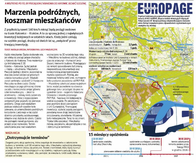 Artykuł o modernizacji linii kolejowej E30 Kraków – Katowice, dofinansowanej ze środków UE w ramach instrumentu finansowego „Łącząc Europę”, pojawia się dziś w naszej gazecie i ponad 60 innych mediach lokalnych w Polsce. To kolejna okazja dla czytelników do wzięcia udziału w konkursie, w którym nagrodą jest wspólny z dziennikarzami wyjazd studyjny do Brukseli. Podczas 3 dni w stolicy Unii Europejskiej możliwe będzie poznanie tajników funkcjonowania instytucji i struktur unijnych.