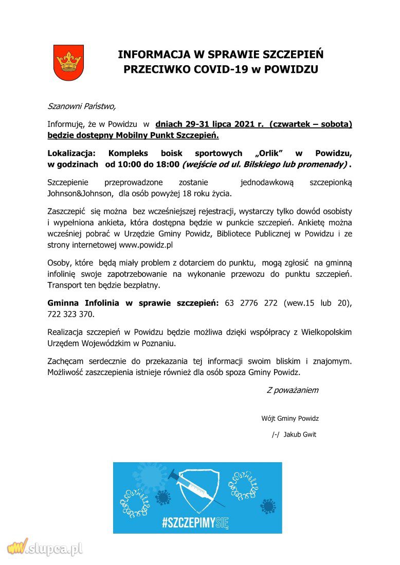 29-31 lipca w godz. 10.00-18.00 na boisku sportowym Orlik w Powidzu będzie mobilny punkt szczepień przeciwko Covid-19. Szczepienie przeprowadzone zostanie jedno dawkową szczepionką Johnson&Johnson. Istnieje możliwość dowozu na szczepienia. Szczegóły pod nr tel. 63 2776 272 wewn. 15 lub 20. Punkt powstał dzięki współpracy z Wielkopolskim Urzędem Wojewódzkim w Poznaniu. Szczegóły poniżej.