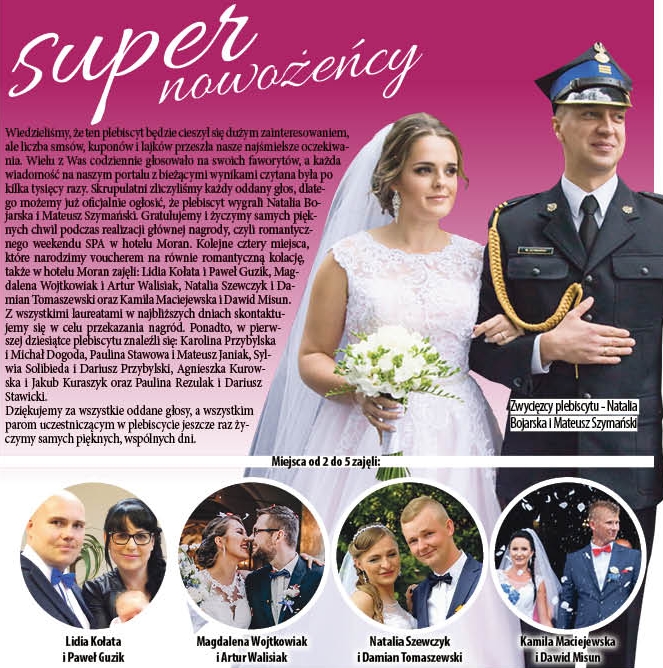 Wiedzieliśmy, że ten plebiscyt będzie cieszył się dużym zainteresowaniem, ale liczba smsów, kuponów i lajków przeszła nasze najśmielsze oczekiwania. Wielu z Was codziennie głosowało na swoich faworytów, a każda wiadomość na naszym portalu z bieżącymi wynikami czytana była po kilka tysięcy razy. Skrupulatnie zliczyliśmy każdy oddany głos, dlatego możemy już oficjalnie ogłosić, że plebiscyt wygrali Natalia Bojarska i Mateusz Szymański. Gratulujemy i życzymy samych pięknych chwil podczas realizacji głównej nagrody, czyli romantycznego weekendu SPA w hotelu Moran. Kolejne cztery miejsca, które narodzimy voucherem na równie romantyczną kolację, także w hotelu Moran zajęli: Lidia Kołata i Paweł Guzik, Magdalena Wojtkowiak i Artur Walisiak, Natalia Szewczyk i Damian Tomaszewski oraz Kamila Maciejewska i Dawid Misun. Z wszystkimi laureatami w najbliższych dniach skontaktujemy się w celu przekazania nagród. Ponadto, w pierwszej dziesiątce plebiscytu znaleźli się: Karolina Przybylska i Michał Dogoda, Paulina Stawowa i Mateusz Janiak, Sylwia Solibieda i Dariusz Przybylski, Agnieszka Kurowska i Jakub Kuraszyk oraz Paulina Rezulak i Dariusz Stawicki.