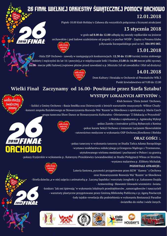 W niedzielę, 14 stycznia w godz. od 9.00 do 12.00 w Domu Kultury i Strażaka przy ul. Powstańców Wielkopolskich w Orchowie będzie czynny punkt krwiodawstwa. O godz. 16.00 na dużej sali powitanie przez szefa sztabu uczestnikow finału. Na scenie wystąpią m.in. lokalni artyści: Klub Seniora „Złota Jesień” w Orchowie, Barbara Smółka oraz dziewczynki z letnich warsztatów muzycznych, Wiktor Chudy, zespół flażoletowy Stowarzyszenia Rozwoju Wsi „Razem” w Słowikowie z opiekunem Marią Czech, grupa taneczna Show Dance ze Stowarzyszenia Kulturalno-Oświatowego 'Z edukacją w przyszłość” w Bielsku z opiekunem Agnieszką Wykręt.