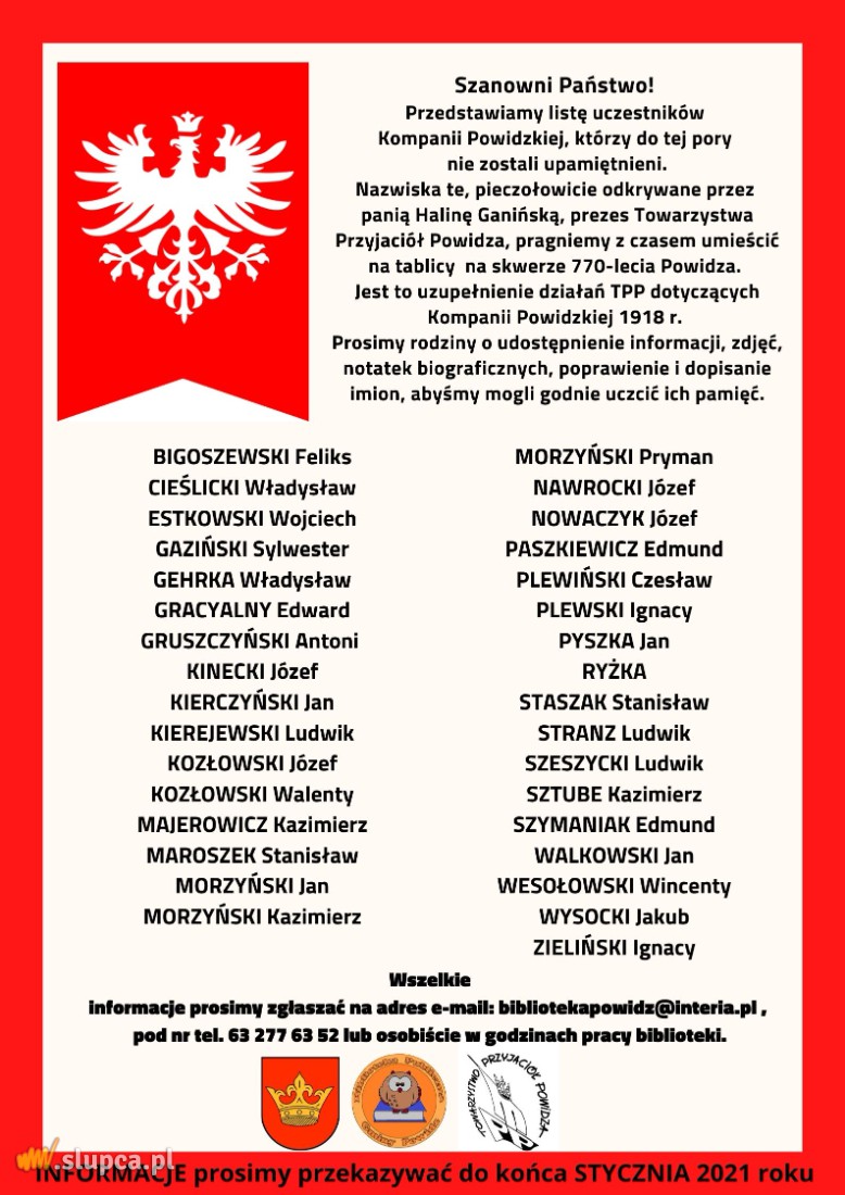 Biblioteka Publiczna Gminy Powidz oraz Towarzystwo Przyjaciół Powidza proszą o pomoc! Przeszukajcie domowe archiwa, pogrzebcie w albumach, poszukajcie informacji o wymienionych uczestnikach Kompanii Powidzkiej! Szczegóły na plakacie poniżej.
