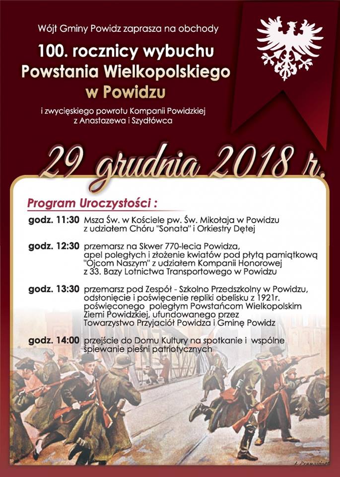 W sobotę, 29 grudnia odbędą się gminne obchody 100. Rocznicy Wybuchu Powstania Wielkopolskiego w Powidzu i zwycięskiego powrotu Kompanii Powidzkiej z Anastazewa i Szydłówca.