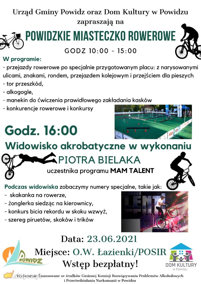 Powidzki Dom Kultury, o ile pozwolą na to warunki pogodowe, zaprasza w najbliższą środę, 23 czerwca na teren Ośrodka Wypoczynkowego „Łazienki” do „Powidzkiego Miasteczka Rowerowego”, współorganizowanego Gminę Powidz. – Mamy nadzieję, że wydarzenie dojdzie do skutku. Jeśli natomiast pogoda nie pozwoli na jego organizację (burza, deszcz) to przekładamy je na wrzesień! Szczegóły na plakacie poniżej.