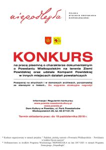Gmina Powidz wraz z Domem Kultury w Powidzu organizuje konkurs ,,Śladami moich przodków Powstańców Wielkopolskich”,którego przedmiotem jest wybór najciekawszej pracy pisemnej o charakterze dokumentalnym (np. w formie opowiadania, reportażu) wraz z udostępnieniem kopii materiałów źródłowych (zdjęć, rękopisów wspomnień, dokumentów, odznaczeń, folderów) o Powstaniu Wielkopolskim na terenie Ziemi Powidzkiej oraz udziale Kompanii Powidzkiej w innych miejscach działań powstańczych. Praca może również obejmować opis realiów politycznych, społecznych i kulturalnych z okresu poprzedzającego wybuch Powstania Wielkopolskiego oraz okres po jego zakończeniu. Termin składania prac upływa 19 października 2018 r. Zasady konkursu na stronie: www.powidz.pl
