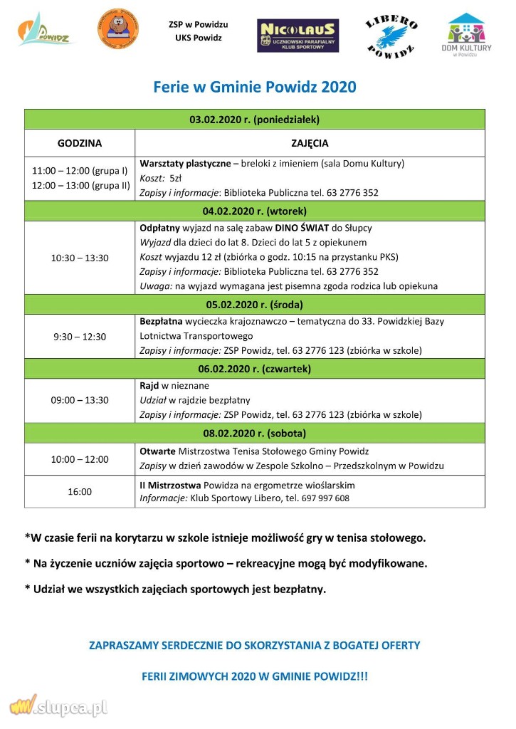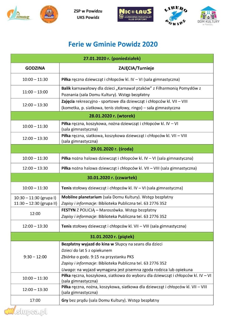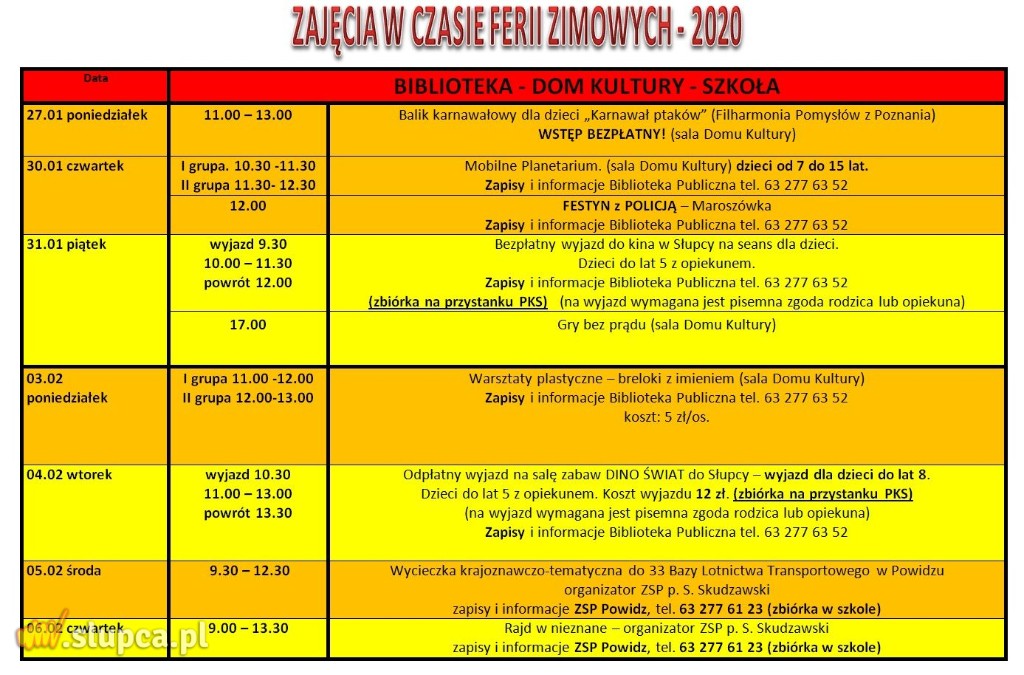 Dom Kultury w Powidzu i Biblioteka Publiczna Gminy Powidz przygotowały ofertę zajęć dla dzieci i młodzieży podczas nadchodzących ferii zimowych 2020. Harmonogram na plakatach poniżej.