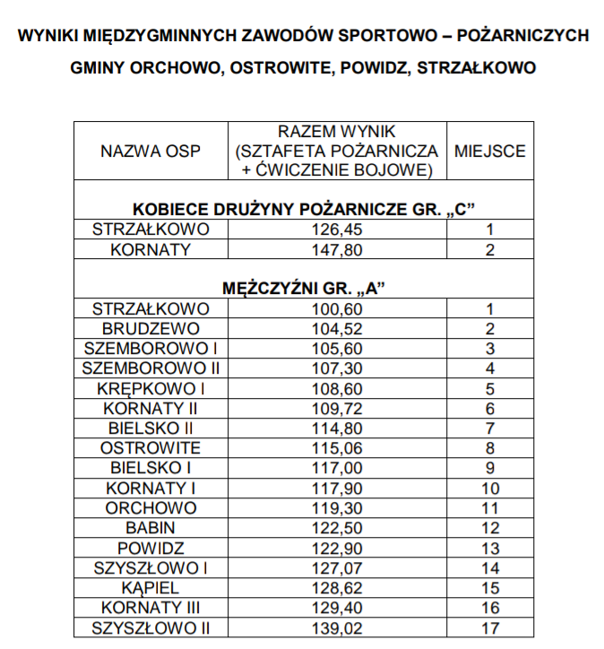 W sobotę 30 czerwca w Orchowie odbyły się Międzygminne Zawody Sportowo – Pożarnicze Gmin: Orchowo, Strzałkowo, Powidz i Ostrowite. W zawodach wzięło udział 17 drużyn męskich oraz dwie kobiece. W ogólnej klasyfikacji wśród drużyn męskich zwyciężyła OSP Strzałkowo, II miejsce zajęła OSP Brudzewo, a III miejsce OSP Szemborowo I. Wśród drużyn kobiecych zwyciężyła OSP Strzałkowo przed OSP Kornaty. Poniżej prezentujemy szczegółową klasyfikację zawodów.
