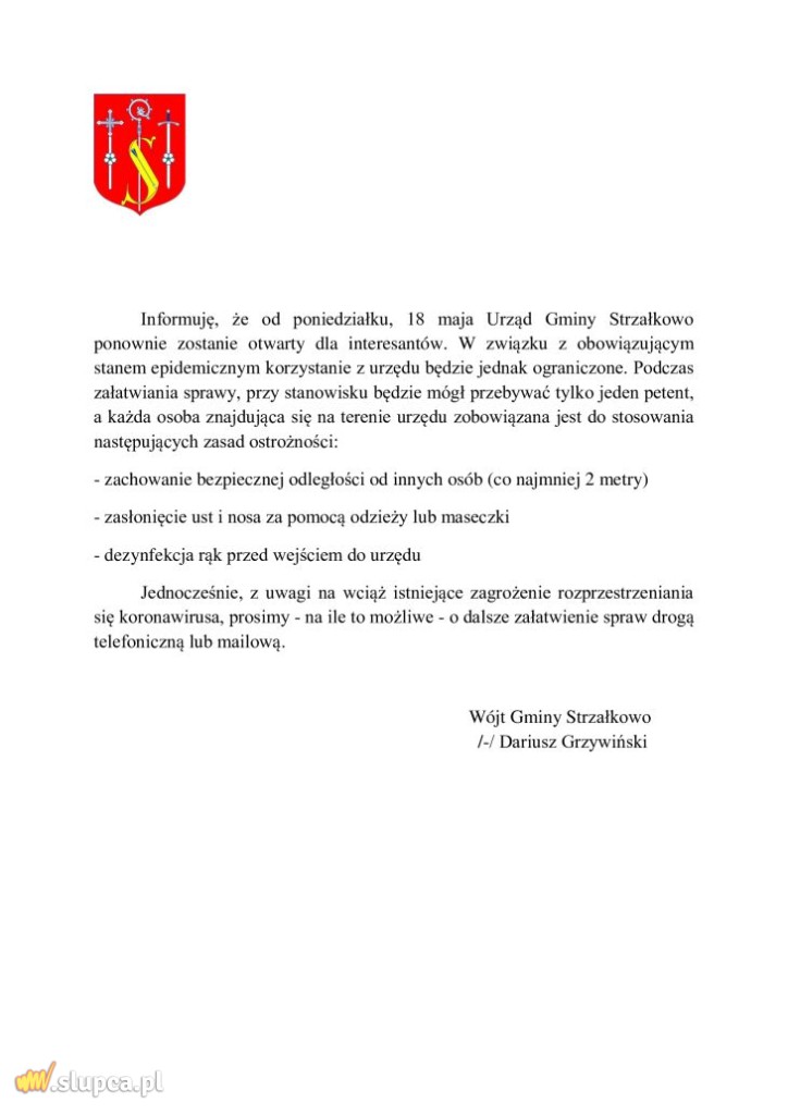 Zgodnie z komunikatem wydanym dzisiaj przez wójta gminy Strzałkowo Dariusza Grzywińskiego, od poniedziałku 18 maja, Urząd Gminy Strzałkowo ponownie zostanie otwarty dla mieszkańców. W związku z obowiązującym stanem epidemicznym, korzystanie z urzędu będzie jednak ograniczone. Podczas załatwiania sprawy, przy stanowisku będzie mógł przebywać tylko jeden petent, a każda osoba znajdująca się na terenie urzędu, zobowiązana jest do stosowania określonych zasad ostrożności. Szczegóły w komunikacie poniżej.