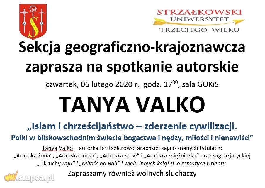 6 lutego na sali Gminnego Ośrodka Kultury i Sportu w Strzałkowie odbędzie się kolejny wykład sekcji krajoznawczo – geograficznej Strzałkowskiego Uniwersytetu Trzeciego Wieku. Tym razem gościem będzie znana pisarka Tanya Valko, autorka bestsellerowej arabskiej sagi o znanych tytułach: „Arabska żona”, 'Arabska córka”, „Arabska krew” i „Arabska księżniczka” oraz sagi azjatyckiej 'Okruchy raju” i „Miłość na Bali”. Autorka wygłosi wykład pt. „Islam i chrześcijaństwo – zderzenie cywilizacji. Polki w bliskowschodnim świecie bogactwa i nędzy, miłości i nienawiści”. Mile widziani wolni słuchacze. Szczegóły na plakacie poniżej. Zapraszamy!