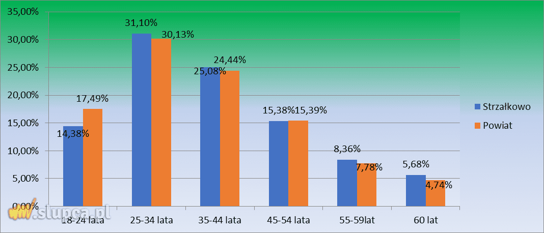 Analizując strukturę bezrobotnych według wieku można zauważyć, że znaczne problemy na rynku pracy miały osoby młode, rozpoczynające swoją karierę zawodową. Najwięcej bezrobotnych – 93 osoby – znajdowało się w przedziale wiekowym 25-34 lata, tj. 31,10%. W dalszej kolejności były osoby w przedziale wiekowym 35-44 lata, które stanowiły 25,08%. Z każdym kolejnym przedziałem wiekowym odsetek osób bezrobotnych spadał.
