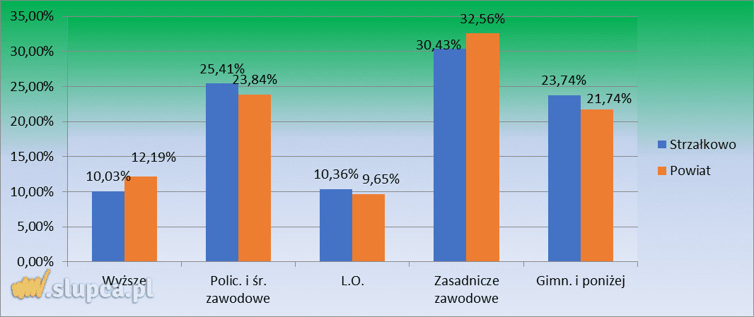 Największą grupę bezrobotnych stanowiły osoby z wykształceniem zasadniczym zawodowym – 91 osób oraz z wykształceniem policealnym i średnim zawodowym – 76 osób. Nieco mniej, bo 71 osób znajdujących się w ewidencji PUP w Słupcy, posiadało wykształcenie gimnazjalne i podstawowe, natomiast 31 osób wykształcenie ogólnokształcące. Najmniej, bo 30 osób legitymowało się wykształceniem wyższym.