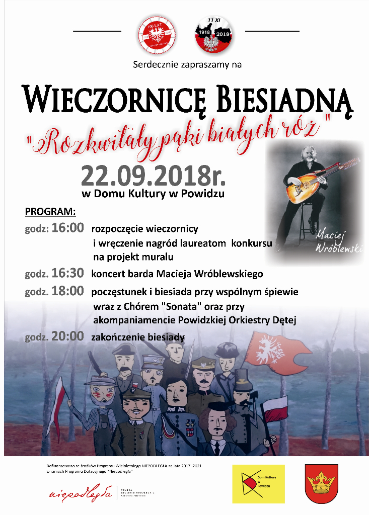 W sobotę 22 września o godz. 16.00 w Domu Kultury w Powidzu odbędzie się wieczornica biesiadna pt. „Rozkwitały pąki białych róż”. W ramach wydarzenia m.in. koncert barda Macieja Wróblewskiego, poczęstunek i biesiada przy wspólnym śpiewie wraz z chórem „Sonata” przy akompaniamencie Powidzkiej Orkiestry Dętej oraz wręczenie nagród laureatom konkursu na projekt muralu.
