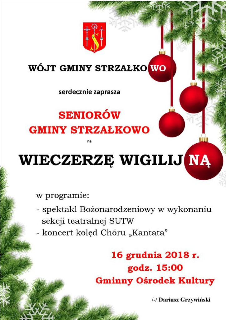 W niedzielę 16 grudnia o godz. 15:00 w sali Gminnego Ośrodka Kultury w Strzałkowie odbędzie się Wieczerza Wigilijna Seniorów. W programie: spektakl Bożonarodzeniowy w wykonaniu sekcji teatralnej Strzałkowskiego Uniwersytetu Trzeciego Wieku i koncert kolęd Chóru „Kantata”. Na wigilię zaprasza wójt Strzałkowa Dariusz Grzywiński.