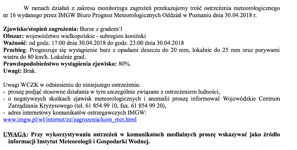 Wygląda na to, że przed nami ostatnie dni pięknej, słonecznej pogody. Od godziny 17.00 w subregionie konińskich zapowiadane są burze z gradem. Szczegóły w komunikacie wydanym przez IMGW.