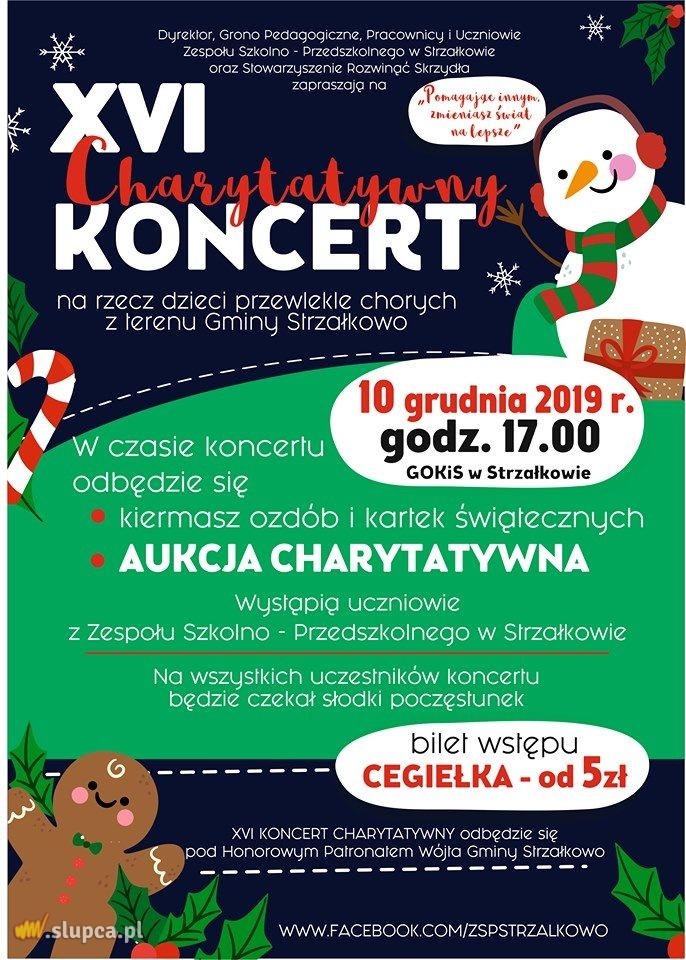 We wtorek, 10 grudnia w Gminnym Ośrodku Kultury i Sportu w Strzałkowie odbędzie się XVI Koncert Charytatywny na rzecz dzieci przewlekle chorych z terenu Gminy Strzałkowo. Zapraszamy razem z całą społecznością Zespołu Szkolno – Przedszkolnego w Strzałkowie! Szczegóły na plakacie.