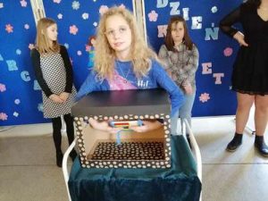 Następnie odbył się konkurs na Super Dziewczynę! 5 uczestniczek sprawdziło swoją wiedzę i umiejętności w 3 konkurencjach: wiedzy o szkole, malowania ust bez lusterka oraz rozpoznawania przedmiotów codziennego użytku wyłącznie poprzez dotyk. Uczestniczki spisały się znakomicie, a zwyciężyła Julka Kaźmierczak z klasy 7. Miejsce drugie zajęła Gabrysia Sobieraj (klasa III ), a miejsce trzecie – Ola Lewandowska (klasa IV).