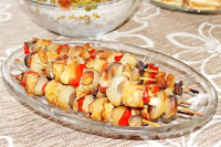 . Pieczarki, cebule, ananasy i boczek pokroić na większą kostkę. Nabijać na patyczki według uznania. opiec na patelni, dusząc później w piekarniku.