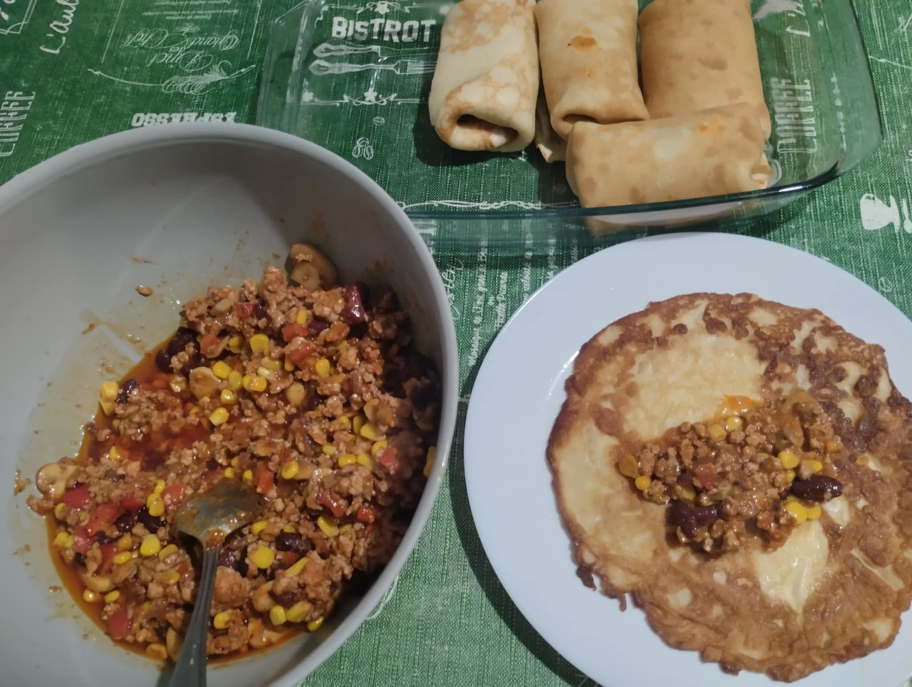 Przygotowanie: Paprykę, pieczarki i cebulę kroimy wg uznania. Wszystko razem podsmażamy na patelni, następnie dodajemy mięso i przyprawy, na końcu dodajemy kukurydzę, fasolę i przecier. Następnym krokiem jest na usmażone naleśniki dajemy farsz i zawijamy jak krokiety, układamy w naczyniu żaroodpornym i posypujemy serem. Wkładamy do piekarnika na 180stopni do rozpuszczenia sera. Najlepiej smakują z sosem czosnkowym.