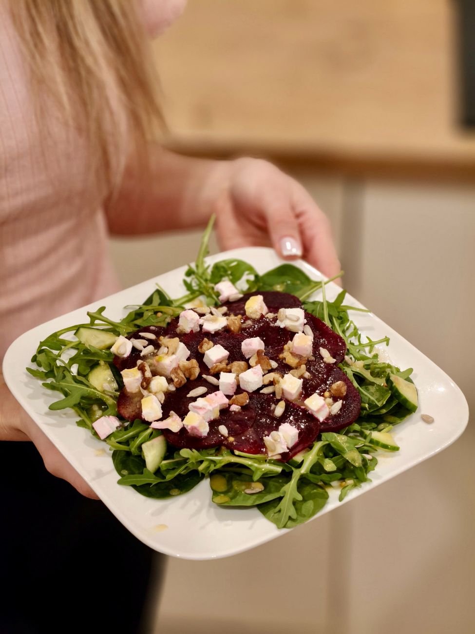 Sposób przygotowania carpaccio z buraków: Buraki pokrój na cieniutkie plasterki i rozłóż na talerzu razem z rukolą. Polej oliwą z oliwek wymieszaną z łyżką soku z cytryny, ugniecionym czosnkiem i miodem . Upraż pestki słonecznika i posyp nimi Carpaccio. Posyp orzechami włoskimi i pokrojonym serem.