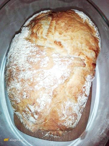 Wszystko razem mieszamy łyżką i przykrywamy pokrywką lub folią spożywczą i wstawiamy do lodówki. Następnego dnia rano podsypać mąką blat i krótko zagnieść ciasto, odstawić do wyrośnięcia na około 30-40 minut. Nagrzać piekarnik razem z garnek i przykrywką na 220 stopni. Do gorącego garnka wrzucić ciasto i przykryć pokrywką. Wstawić z powrotem do piekarnika i piec w 200 stopniach około 35 minut. Potem zdjąć pokrywkę i piec jeszcze 20 minut.