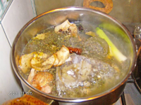 Głowy ryb płuczemy pod bieżącą wodą, zalewamy zimną wodą, doprowadzamy do wrzenia, odszumowujemy, dodajemy obraną włoszczyznę, suszone owoce, garść majeranku, listki laurowe, ziele angielskie i gotujemy na małym ogniu do czasu, aż włoszczyzna zmięknie. Całość odcedzamy do innego garnka, doprawiamy octem (3 łyżeczki), cukrem, doprowadzamy do wrzenia i wlewamy zaklepkę. Gdy zupa zgęstnieje, zdejmujemy garnek z kuchenki i dodajemy słodką śmietankę tak, aby się nie zważyła. Zupę podajemy z domowym makaronem lub łazankami.