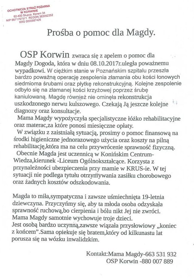 OSP Korwin organizuje pomoc dla Magdy Dogody z Józefowa, która 8 października uległa poważnemu wypadkowi na skrzyżowaniu ul. Kopernika i Sikorskiego w Słupcy. Jej historię szczegółowo przedstawimy w piątkowym numerze Kuriera, ale już teraz apelujemy o wsparcie dziewczyny w walce o powrót do zdrowia. Poniżej apel strażaków z Korwina w tej sprawie.