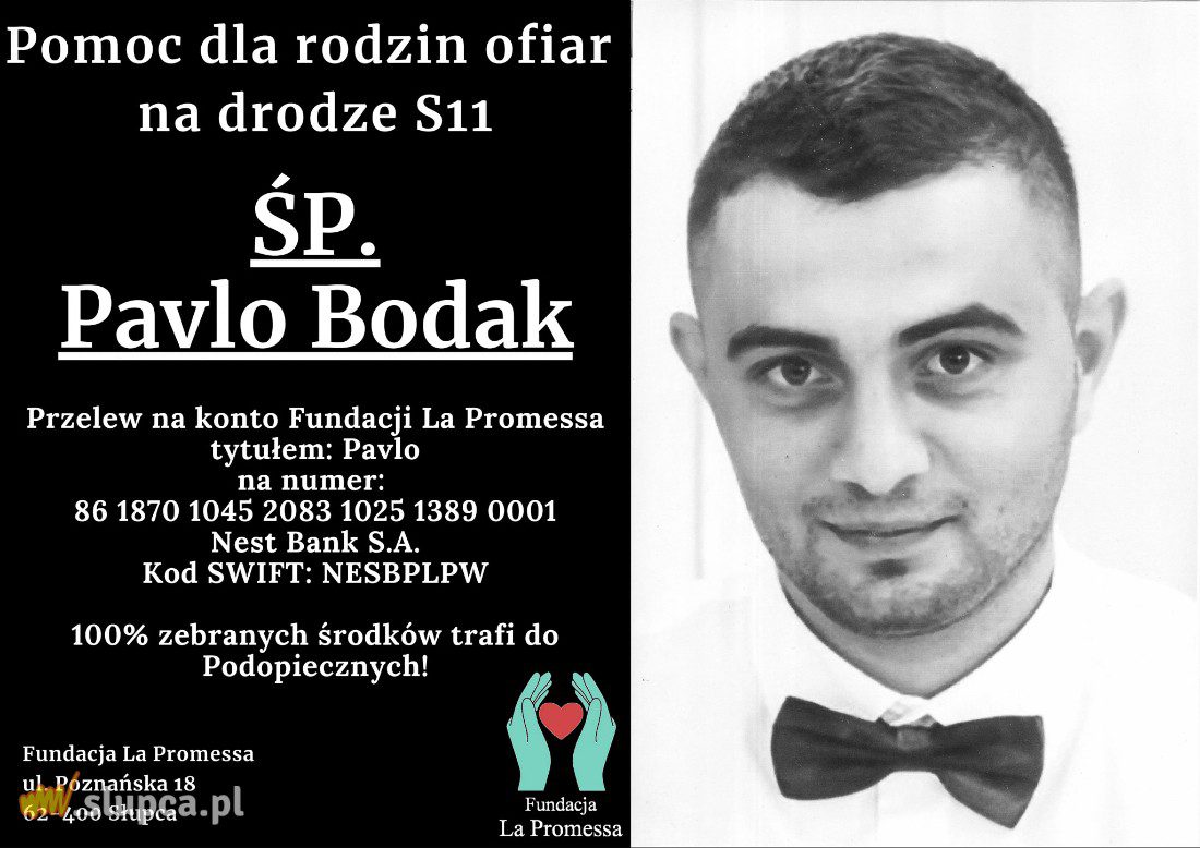 Pavlo Bodak (†24 lat), obywatel Ukrainy, pracownik z Kotuni, zginął w wypadku na drodze S11. Fundacja La Promessa organizuje zbiórkę pieniędzy dla jego rodziny.