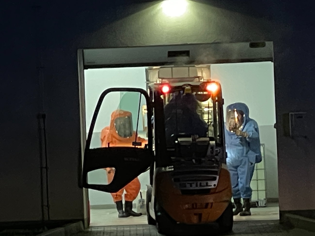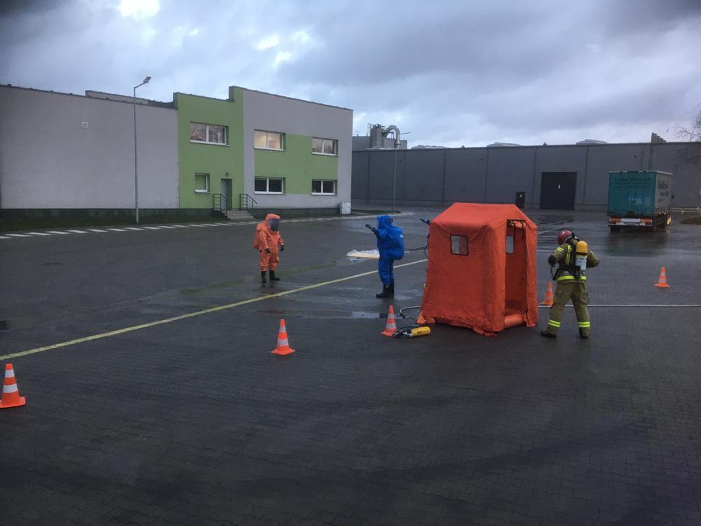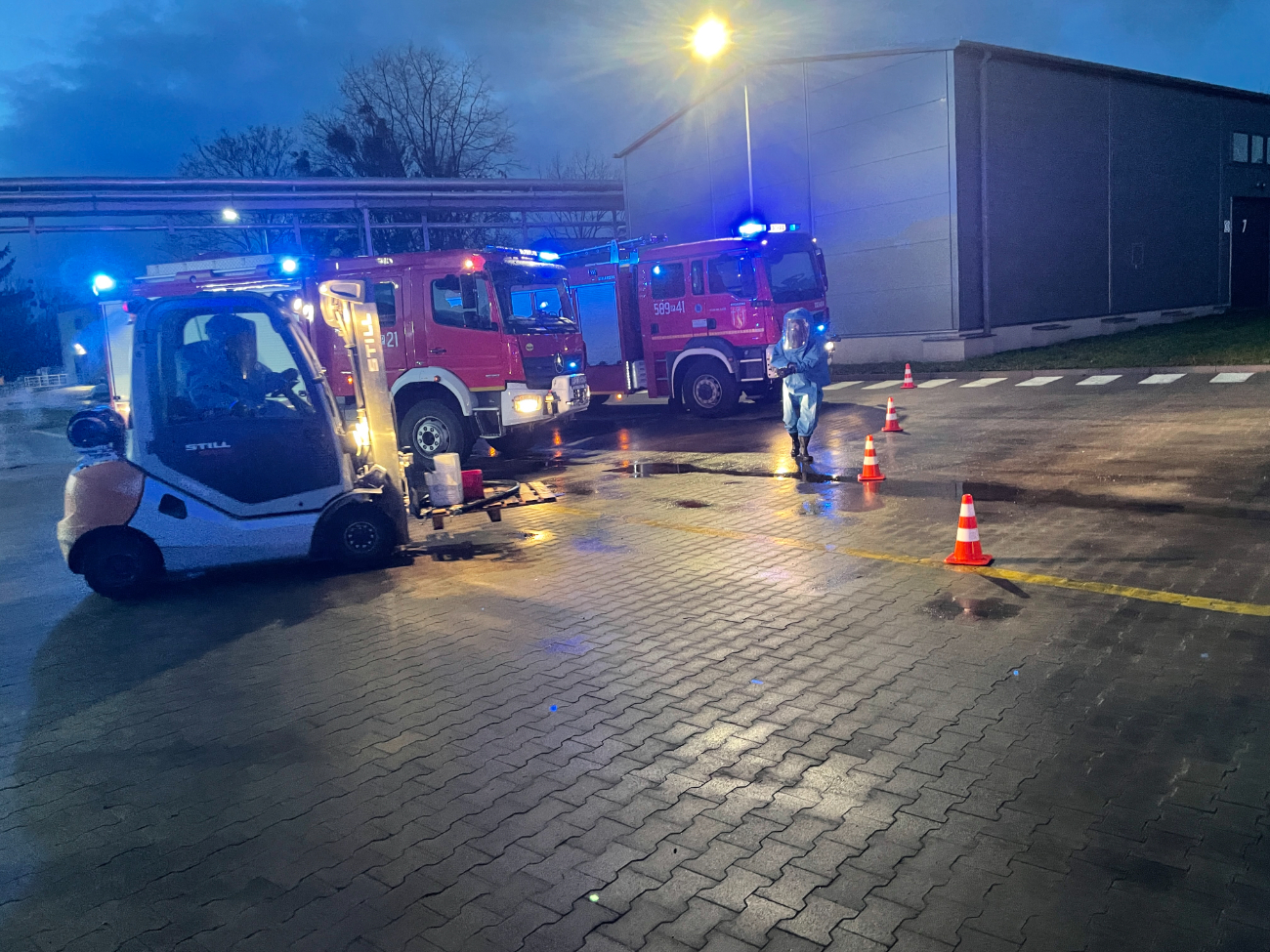 – 3 stycznia o godzinie 12.49 do Stanowiska Kierowania Komendanta Powiatowego PSP w Słupcy wpłynęło zgłoszenie o wycieku środka sieciującego z paletopojemnika w Wielkopolskim Przedsiębiorstwie Przemysłu Ziemniaczanego w Stawie gm. Strzałkowo, brak osób poszkodowanych. Po dotarciu pierwszych zastępów straży pożarnej na miejsce zdarzenia otrzymano dokładną informację co do substancji jaka wyciekła ze zbiornika i była to mieszanina bezwodnika kwasu octowego oraz kwasu adypinowego – po kontakcie z wodą substancja bardzo wybuchowa. Strażacy po dokonanym rozpoznaniu wyznaczyli strefę zagrożenia, ewakuowali trzy osoby z przylegającego budynku na zewnątrz w bezpieczne miejsce. Przy wykorzystaniu specjalnych ubrań chemicznych rota zabezpieczyła i obwałowała sorbentem wyciek z paletopojemnika. Dalsze działania prowadziła przybyła na miejsce zdarzenia Specjalistyczna Grupa Ratownictwa Chemiczno-Ekologicznego z Poznania, która przelała w/w substancję w inny zbiornik likwidując zagrożenie. Działania strażaków trwały ponad 6 godzin. Na miejscu zdarzenia pracowało dziesięć zastępów straży pożarnej z JRG Słupca, SGRChem-Eko Poznań 6, OSP Strzałkowo – informuje mł. bryg. Mariusz Pawela.