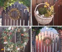 Od furtki, na której właścicielka w zależności od pory roku zawiesza wykonane przez siebie ozdoby – tzw. witacze, patrząc na wprost, widać frontowe wejście do domu, z niedużym tarasem. Na nim po prawej stronie pod ścianą stoją betonowe donice, z nich po kutych podporach wspinają się pnącza. Kompozycję dopełniają ozdoby z wikliny, stylizowana ławka ze stolikiem, latarenki, rośliny doniczkowe i wiele innych, dobranych tak, by podkreślić aktualną porę lub zbliżające się święta. Frontowa część obsadzona jest głównie zimozielonymi roślinami w kształcie stożków i kul, uzupełniają je hosty, czosnek olbrzymi, hortensje i najwcześniej kwitnące ciemierniki. Idąc w prawo wzdłuż półkolistej rabaty, która okolona jest niskim formowanym żywopłocikiem z bukszpanu, do którego Monika, jak sama przyznaje ma słabość, dotrzemy do tarasu. Mijaną rabatę porastają róże, lawendy, trawy ozdobne, lilak, szczepiona trzmielina i wiele innych, tworząc raj dla owadów i ucztę dla oka.