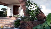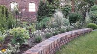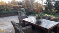 Taras z zewnętrznym kominkiem, rattanowymi meblami i parasolem, ozdobiony donicami z kulistymi bukszpanami i kwitnącymi na biało roślinami sezonowymi, jest doskonałym miejscem spotkań i relaksu dla domowników oraz ich labradorki, która chętnie dotrzymuje wszystkim towarzystwa. Przy tarasie uwagę zwraca, spójna stylistycznie z domem, ceglana ściana z oknami, przechodząca w niski murek, który niknąc z oczu za zakrętem zaprasza, by podążyć wytyczonym przezeń szlakiem. Tak trafiamy do pachnącego zakątka. Tworzy go wspomniany mur, przechodzący w drewniane ogrodzenie, którego przedłużeniem jest ściana z formowanego grabowego żywopłotu z jednej strony oraz cisowego z drugiej. Nazwany jest pachnącym, gdyż w okresie kwitnienia posadzonych tu róż, lilii i lawendy otumania słodkim zapachem, przyprawiającym o zawrót głowy. A prawie białym, dlatego, że ulubiony kolor kwiatów Moniki to właśnie biały. Odrobinę innych barw, wpadających w delikatne fiolety, wprowadzają hortensje, bladoróżowe róże oraz naparstnice.