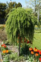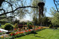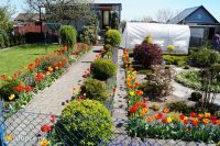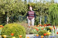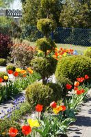 W dniu kiedy gościliśmy na działce przypadał akurat szczyt kwitnienia tulipanów, których gospodyni ma bardzo dużo i które swoimi kwiatami wypełniły przestrzeń wzdłuż ścieżki prowadzącej od furtki do schodów domu. Po prawej stronie działki znajduje się samodzielnie zaprojektowana i wykonana okrągła rabata, na której wczesną wiosną kwitną rośliny cebulowe. Niestety gościliśmy na działce już po ich przekwitnieniu, nijak to jednak nie umniejszyło uroku kompozycji, którą dopełniają zimozielone kule z bukszpanu również samodzielnie wyhodowane przez właścicielkę. Patrząc na układ ogrodu odnosi się ważenie, że pani Jadwiga ukochała sobie geometryczne formy a zwłaszcza te kuliste, tak cięte są tuje, berberysy czy trzmieliny. Zaznaczyć trzeba, że cała roślinność sprawia wrażenie bardzo uporządkowanej i zadbanej. Za okrągłą rabatą góruje cieplarnia a za nią odkryte grządki, będące źródłem warzyw sezonowych. Nad grządkami wznosi się pergola podtrzymująca ulubione odmiany winorośli.