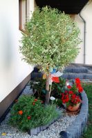 Przy wejściu do domu na wąskiej rabacie rośnie strzyżona w kulkę wierzba japońska Hakuro, azalia, lawenda i czerwone pelargonie rabatowe, przy których siedzi jeż. Na tarasie poza pelargoniami angielskimi i begoniami stale kwitnącymi dumnie prezentuje się palma madagaskaru, która w tym roku zachwyca białymi kwiatostanami podobnymi do kwiatów barwinka. Pochypodium lamerei zwany potocznie palmą madagaskarską lub gwiazdą stepową jest pięknym sukulentem pędowym. W rzeczywistości niewiele ma wspólnego z palmą poza charakterystyczną sylwetką, czyli grubym pędem głównym z parasolowatymi rozetami liści na szczycie. Silnie zgrubiałe pędy wyposażone są w liczne, ostre ciernie pokrywające gęsto całą ich powierzchnię. Nie jest odporna na mróz, więc na zimę musi wrócić do domu.