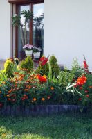 Na działce rośnie sporo świerków srebrnych i zwyczajnych, sosny i daglezja. Od strony garażu pod ogrodzeniem posadzono żywotniki – tuje, które zostały wykorzystane typowo funkcjonalnie, jako żywopłot. Przy skarpie tarasowej na rabacie kwitną bujnie aksamitki (turki), gladiole (mieczyki), niestety nie udało nam się zobaczyć fioletowych lilii, które już zrzuciły kwiaty, ale jeśli wierzyć pani Agnieszce były spektakularne.