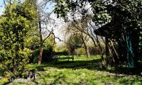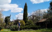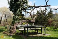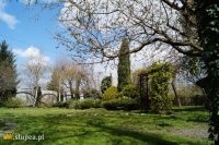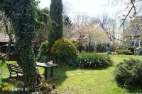 Ogród ma charakter naturalistyczny. Teraz wiosną mimo, że nawet wczesne kwiaty jeszcze nie rozkwitły, sprawia wrażenie zadbanego i przyjemnego dla oka. Z tarasu za okrągłą rabatę z tujami i jukami ogrodowymi, prowadzi wyłożona kamiennymi płytkami ścieżka – dzieło pana domu. Jest tam kolejne miejsce stworzone z myślą o biesiadowaniu. Pod malowniczo obrośniętym zimozielonym bluszczem drzewem, znajduje się stół i ława, jest to ulubione miejsce kotów, które wygrzewają się w promieniach słońca leżąc na blacie. Kawałek dalej stoi wygodna ławka, można się na niej skryć przed okiem ciekawskich i poczytać w spokoju książkę lub napić się pysznej herbaty z miodem serwowanej przez gospodarza. Podążając ścieżką dojdziemy do schowanego pod wiatą warsztatu ogrodowego pana Kazimierza, a z niego przechodząc pod obrośniętą roślinami pergolą, możemy swe kroki skierować z powrotem na wzniesiony taras lub na część ogrodu znajdującą się przy wejściu do domu.