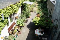 Ogród jest podłużny, kryje się między dwiema wysokimi ścianami odgradzającymi posesję od sąsiadów. Wychodząc z kamienicy trafiamy na kącik wypoczynkowy ze stolikiem i krzesłami, gdzie można usiąść na poranną kawę, poczytać książkę i obserwować życie toczące się w zielonej głębi. Uroku i tajemniczości dodają spatynowane lustra powieszone na murze z prawej strony.