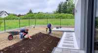Jesienne trawniki zakłada też znana na lokalnym rynku firma LD Servis pana Leszka Duszyńskiego, w którego ogrodzie gościliśmy niedawno przy okazji naszego cyklu. Pan Leszek zamienił swoją pasję w sposób na życie i od 2014 roku zajmuje się zakładaniem i pielęgnacją ogrodów. Przy okazji naszego ostatniego spotkania okazało się, że pan Leszek testuje dostępną od niedawna w sprzedaży matę nasienną w rolce, zapytany o pierwsze wrażenia powiedział: Na dzień dzisiejszy mogę powiedzieć tylko tyle, że jest łatwa w użyciu, mamy pewność, że nie zmyje i nie wywieje nasion, przy odpowiednim zabezpieczeniu i przysypaniu nie ma możliwości zerwania całych rolek, no i najprawdopodobniej zahamuje lub wręcz zniweluje rozwój chwastów znajdujących się w glebie. To jednak okaże się za jakiś czas. Trawnik został świeżo wysiany o efektach dowiemy się za jakieś dwa tygodnie.