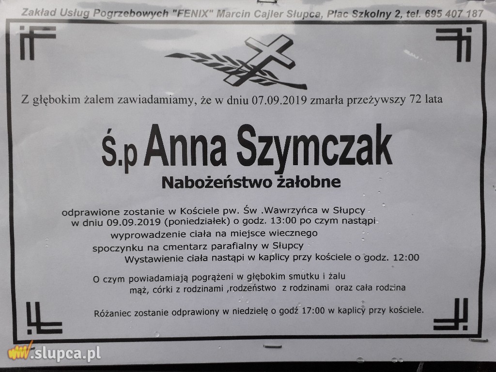 Dziękujemy Ci ukochana Św pamięci Pani Aniu Szymczak za twoje świadectwo wiary za twoją nieoceniona pomoc w każdej potrzebie a szczególnie za każdą pomóc z Twojej strony wierzymy że dobry Pan przyjemnie Cię do swojego domu.Wieczny odpoczynek. Współczuję rodzinie.