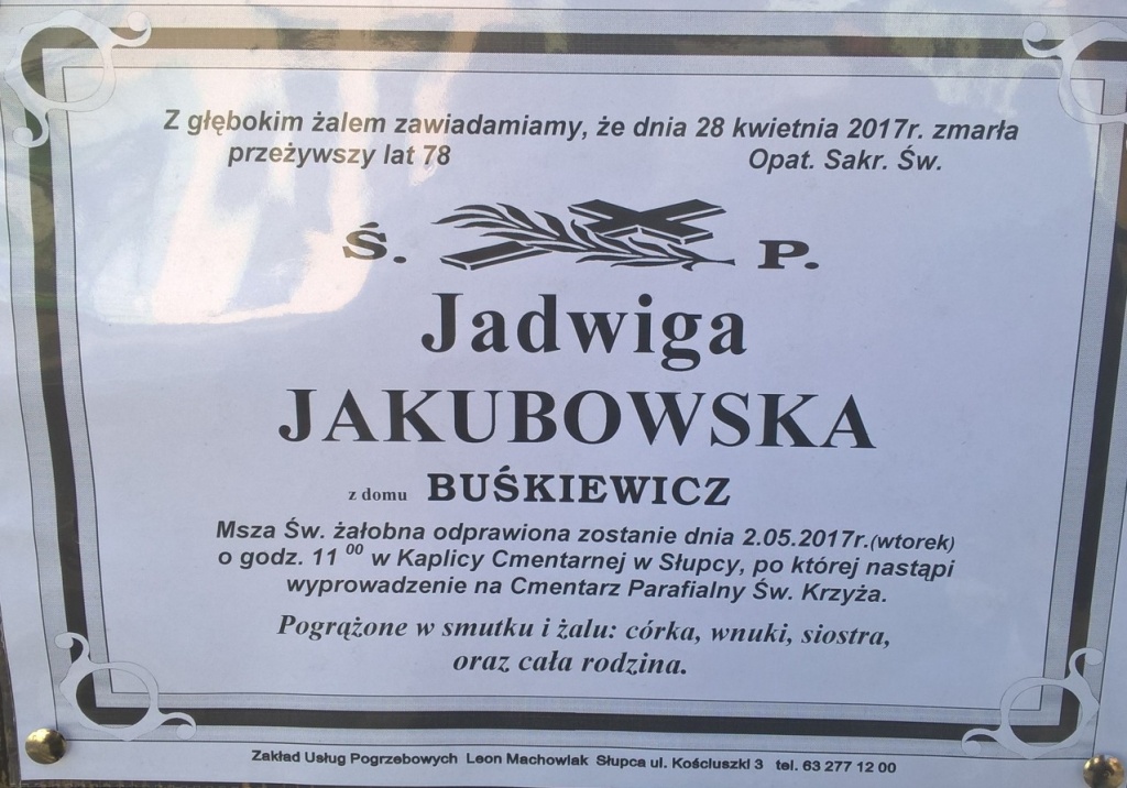 Jadwiga Jakubowska, l. 78, zm. 28.04