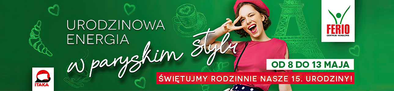 W ramach obchodów okrągłych urodzin, Ferio Konin przygotowało moc urodzinowych atrakcji. Od 8 do 13 maja centrum zaprasza wszystkich chcących dołączyć do jubileuszowej zabawy. Na klientów Ferio czekają wyjątkowe nagrody, w tym vouchery na wycieczkę do Paryża z ITAKĄ.
