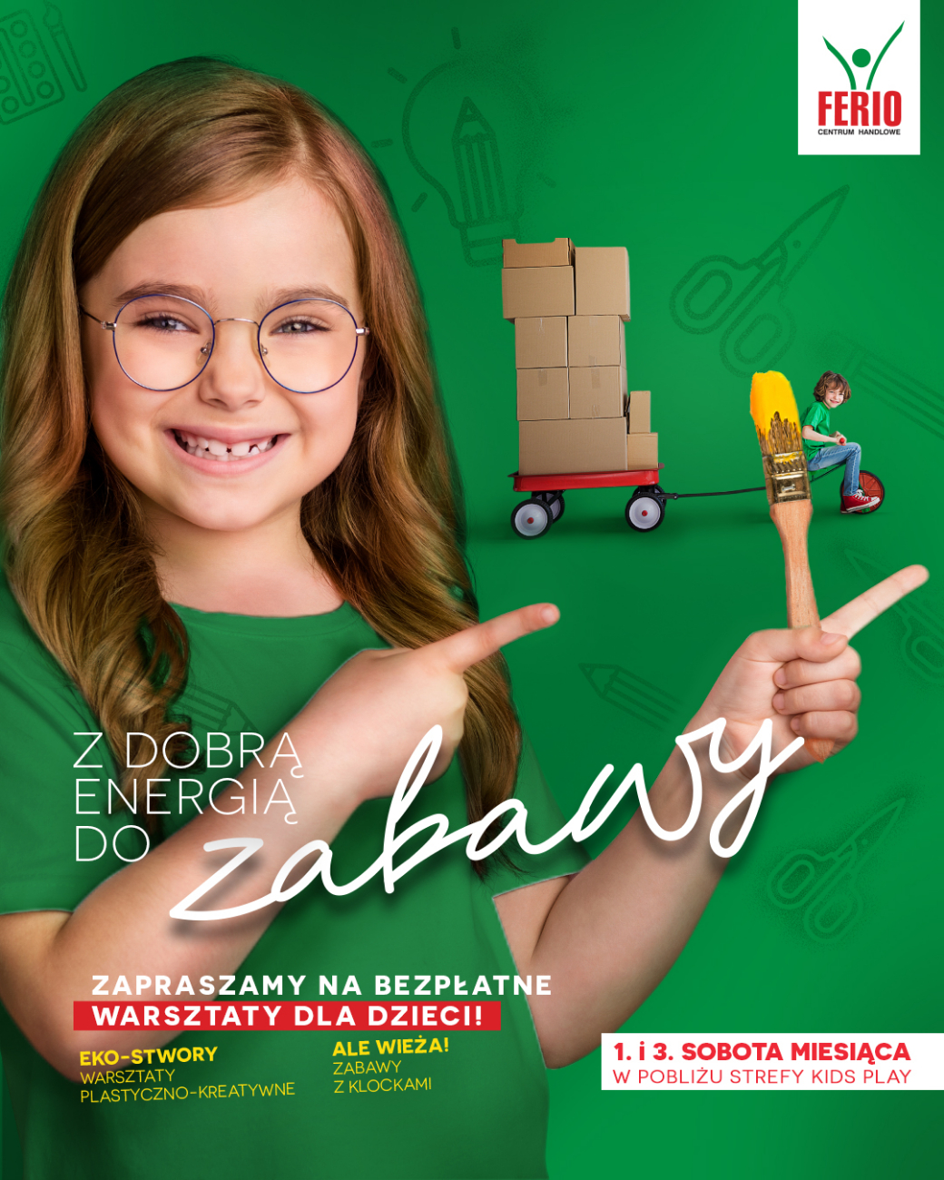 Otwarta we wrześniu zeszłego roku strefa KIDS PLAY została niedawno wzbogacona o bezpłatne warsztaty dla najmłodszych. W każdą pierwszą i trzecią sobotę miesiąca najmłodsi klienci centrum mogą korzystać z warsztatów plastycznych i rozbudowanej strefy zabaw. Rodziców z dziećmi Ferio niezmiennie zaprasza do strefy we wszystkie dni, w których otwarte jest centrum, w godzinach 09.00 – 21.00.